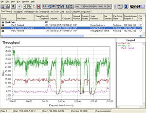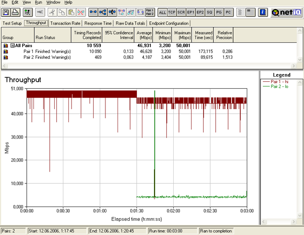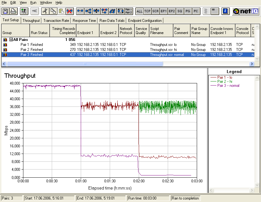Тест 3: теперь запустим 3 потока трафика, к двум из которых применим правила шейпинга (числовые значения приоритетов 100 и 101). 3-й поток трафика правилами шейпинга никак не описывается. После этого посмотрим, как ведут себя потоки трафика при их последовательном запуске, начиная с потока, к которому не применяются правила шейпинга и заканчивая потоком с наибольшим приоритетом.