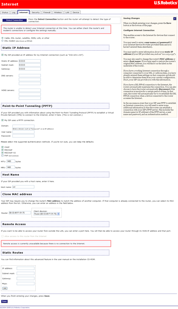 Здесь задаются параметры подключения к Интернет. Рассматриваемый роутер позволяет устанавливать PPTP и PPPoE соединения. Здесь также можно задать клонирование MAC-адреса (задать MAC-адрес вручную устройство не позволяет) и прописать записи статического роутинга.