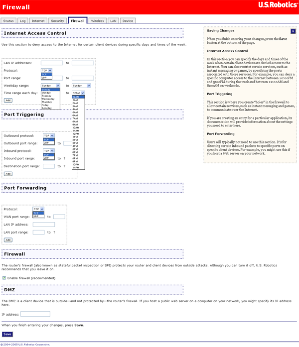 Здесь задаются параметры работы файрвола, а также задаются виртуальные сервера и порты для "специальных приложений" (которые не могут работать через NAT без доп. настройки)