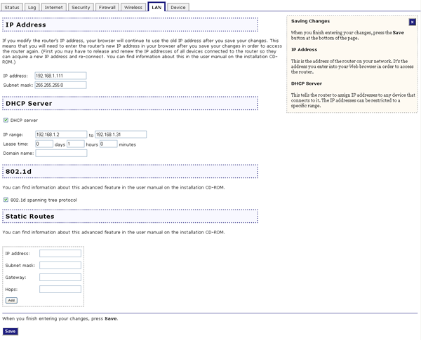 Здесь задаются IP-адрес LAN-сегмента и параметры DHCP-сервера