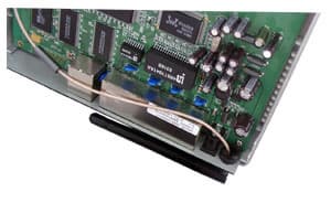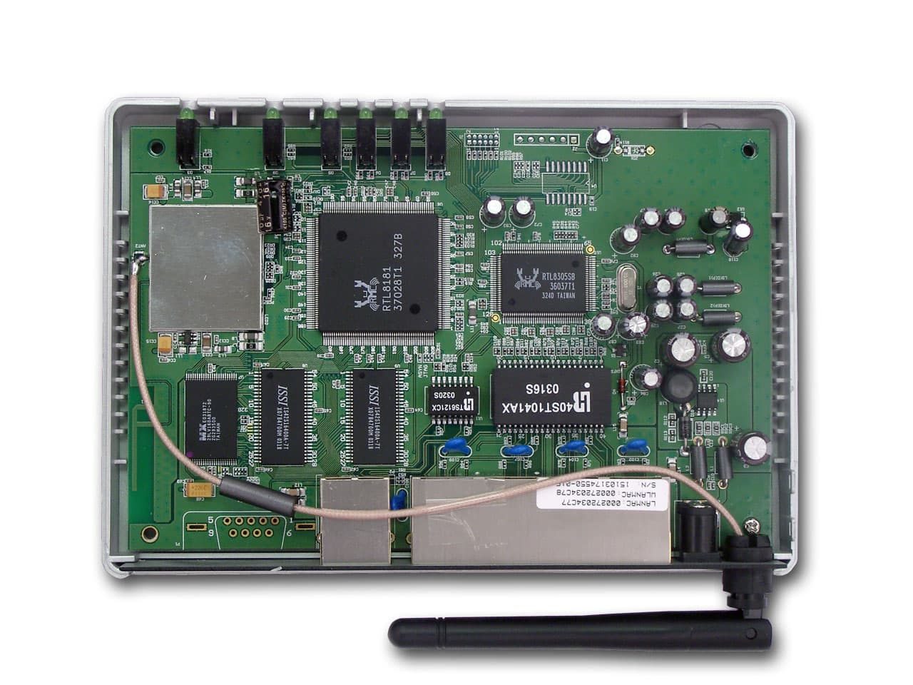 Роль встроенного 10/100 Мбит Ethernet коммутатора выполняет микроконтроллер RTL8305SB. Так же на плате видно две микросхемы SD-RAM памяти ISSI IS42S16400A, каждая объемом 64 Мбит (c максимальной частотой работы 166 МГц) и микросхема flash-памяти неизвестного объема (но не более 4 Мбайт).