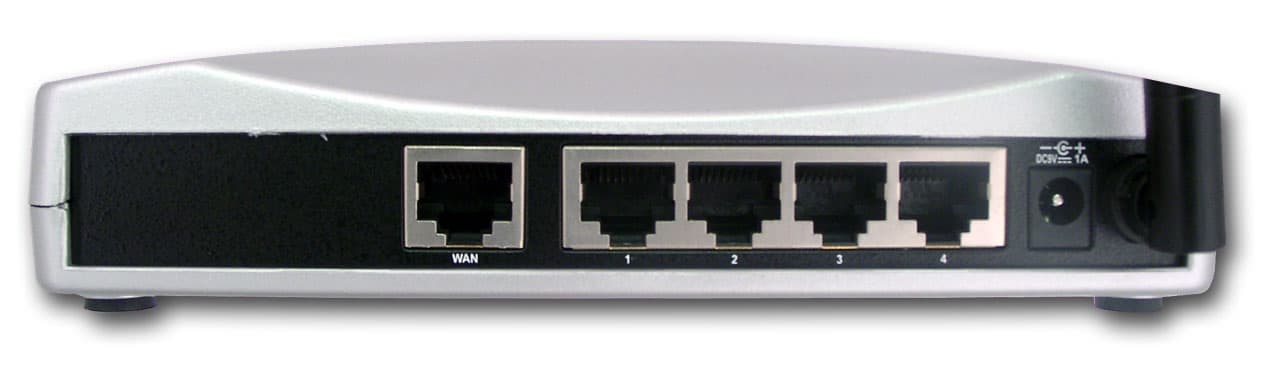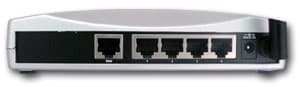 В задней части устройства расположены четыре RG45 разъема LAN портов, один аналогичный разъем WAN порта и разъем питания.