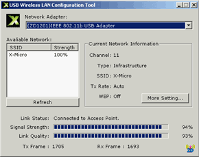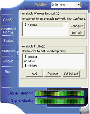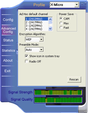 В главном меню можно просканировать диапазон на наличие доступных беспроводных сетей и подключится к нужной. Тут же можно посмотреть уровень сигнала и качество линка (в версии для PCMCIA карты это выглядит в виде бегущих слева направо вертикальных столбиков). Софт так же дает возможность настраивать и сохранять несколько профайлов для разных сетей.