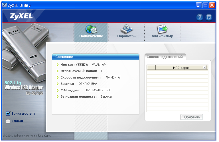 Несомненным преимуществом обеих беспроводных адаптеров является возможность их работы в режиме программной точки доступа. Единственное, что при этом немного омрачает ситуацию — при использовании беспроводных адаптеров в качестве програмнной точки доступа мы можем использовать только WEP-шифрование беспроводной связи (остальные виды шифрования даже не поддерживаются). Думаю, что требовать от дополнительных режимов работы поддержки всех возможностей точки доступа все же не стоит — софтовый «бонус» не сможет полноценно заменить «железное» решение.
