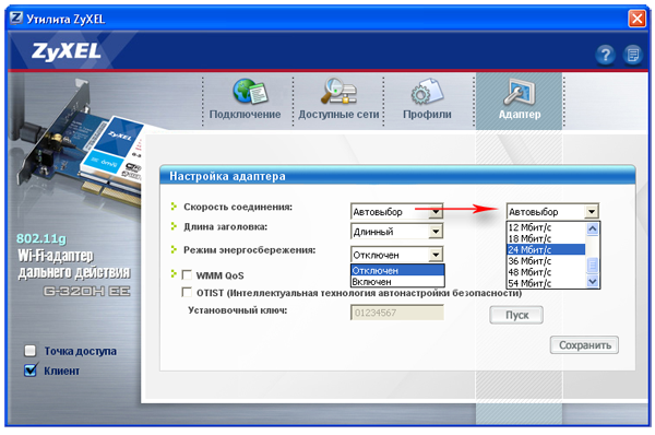 Также есть возможность принудительно задать скорость соединения беспроводного адаптера с точкой доступа.