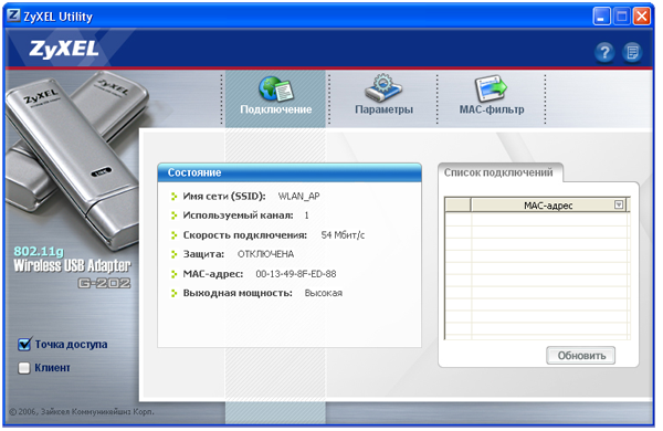 - При одновременной работе беспроводных адаптеров с точкой доступа на интернет-центре ZyXEL P-330W, скорость работы USB-адаптера сущестенно снижается