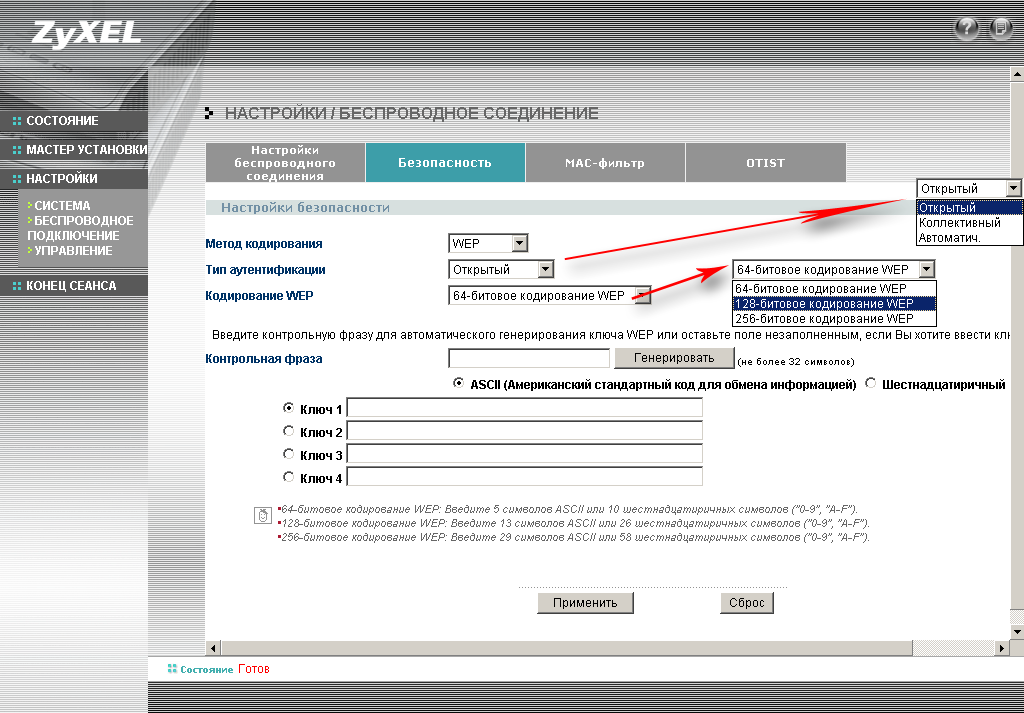 | WEP шифрование | 64/128/256bit, ASCII или HEX ключи | |||