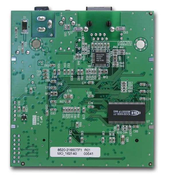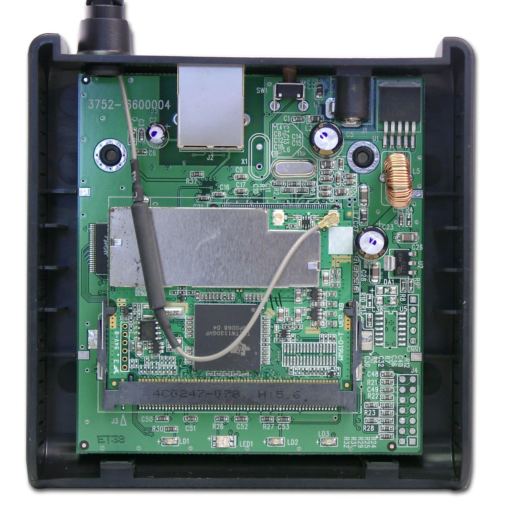 Беспроводная часть точки доступа выполнена в виде отдельной mini-PCI платы, расположенной на основной плате устройства на базе контроллера Texas Instruments TNETW1130. Экран на этой плате, скрывающий под собой трансивер, закреплен металлическими крепежами (на картинке: на левой и на правой стороне экрана) — поэтому снять его не удалось.