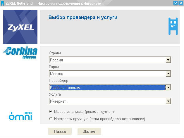Выбираем наше местоположение, наименование провайдера услуг и собственно саму услугу. В программе уже присутствует вариант подключения к сети Corbina Telecom.