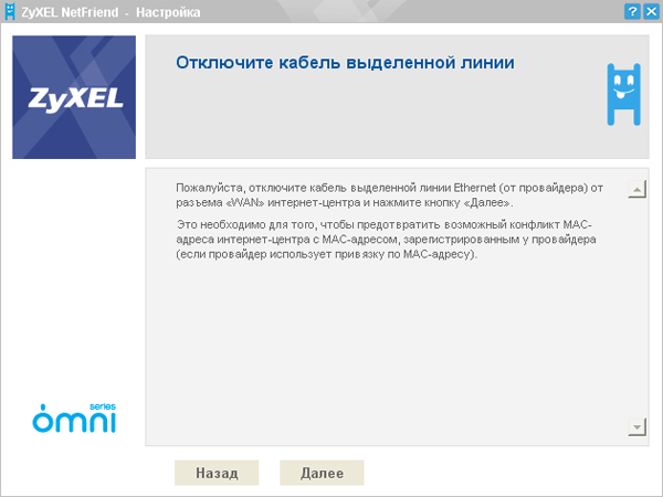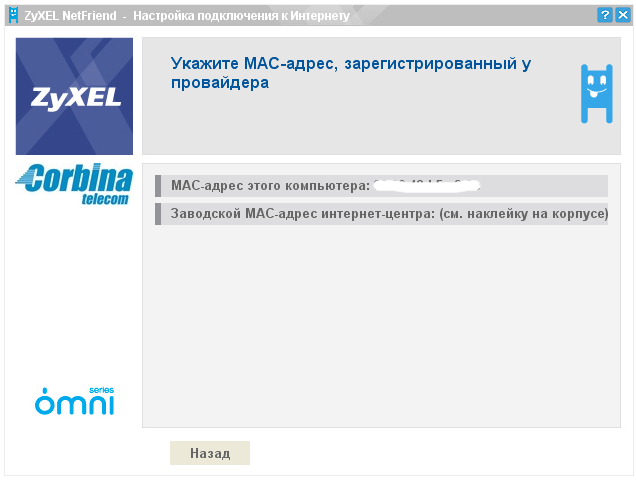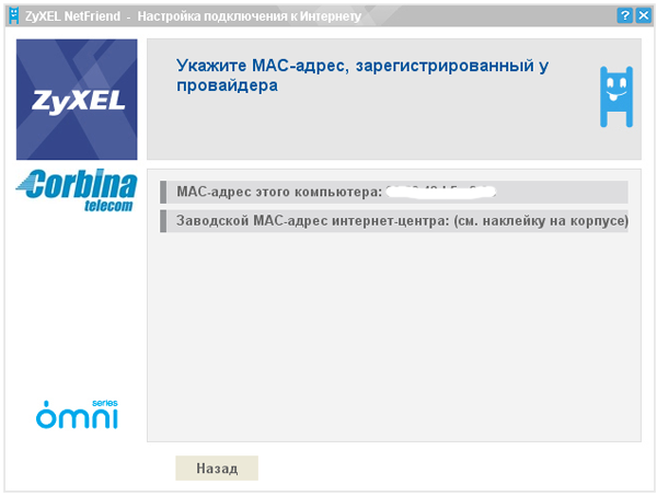 Утилита ZyXEL NetFriend предлагает либо использовать "заводской" MAC-адрес интернет-центра либо назначить WAN-интерфейс MAC-адрес компьютера, на котором запущена утилита NetFriend. Прописать MAC-адрес вручную данная утилита не позволяет — это можно сделать только через WEB-интерфейс настройки интернет-центра либо через его консольный интерфейс.