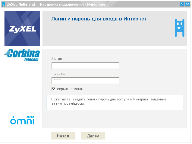 Далее мы вводим логин и пароль, выданные нам при подключении к сети Corbina Telecom.