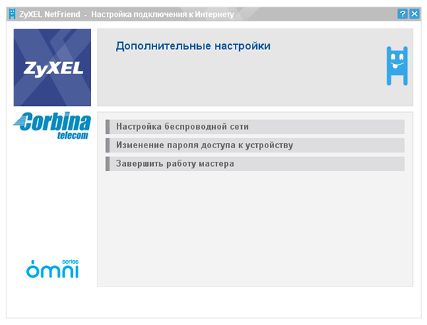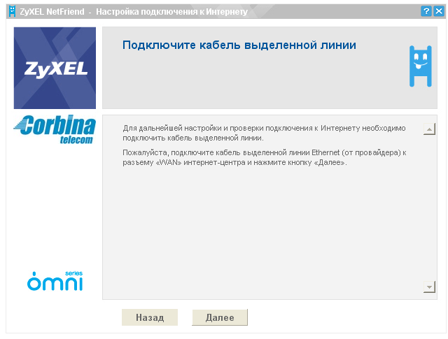 Далее мы вкратце рассмотрим возможность подключение к провайдеру Corbina Telecom посредством утилиты ZyXEL NetFrind. Напмню, что компания ZyXEL позиционирует ее как основной инструмент настройки интернет-центров для рядовых пользователей. Данная утилита поставляется на диске, идущем в комплекте к устройству, ее установка не вызывает затруднений.