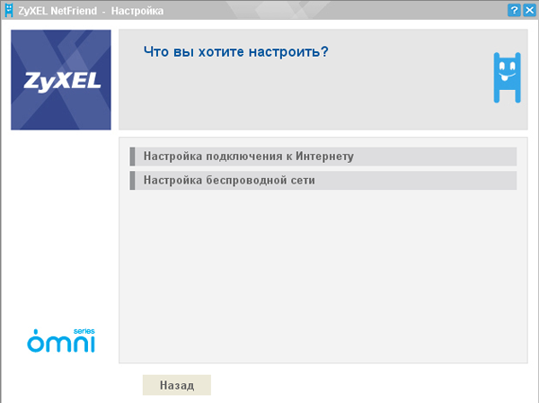Следом нам предлагается настроить подключение к Интернет или же настроить беспроводную сеть для подключения беспроводных клиентов. Настройку беспроводных подключений мы уже рассматривали в обзоре непосредственно посвященном утилите ZyXEL NetFriend. В какой последовательности производить настройку интернет-центра (сначала подключение к сети Интернет, а затем беспроводную связь или же наоборот) значения не имеет. Мы выбираем пункт — подключение к сети Интернет.