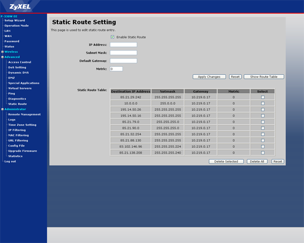 Для полноценной работы в сети Corbina Telecom также требуется прописать на интернет-центре правила статической маршрутизации — утилита ZyXEL NetFriend делает это автоматически. В нашем случае в таблицу маршрутизации было добавлено 10 статических маршрутов, отвечающих за доступ к локальным ресурсам провайдера, доступ к DNS-серверам, PPTP-серверу провайдера и другим локальным сервисам.