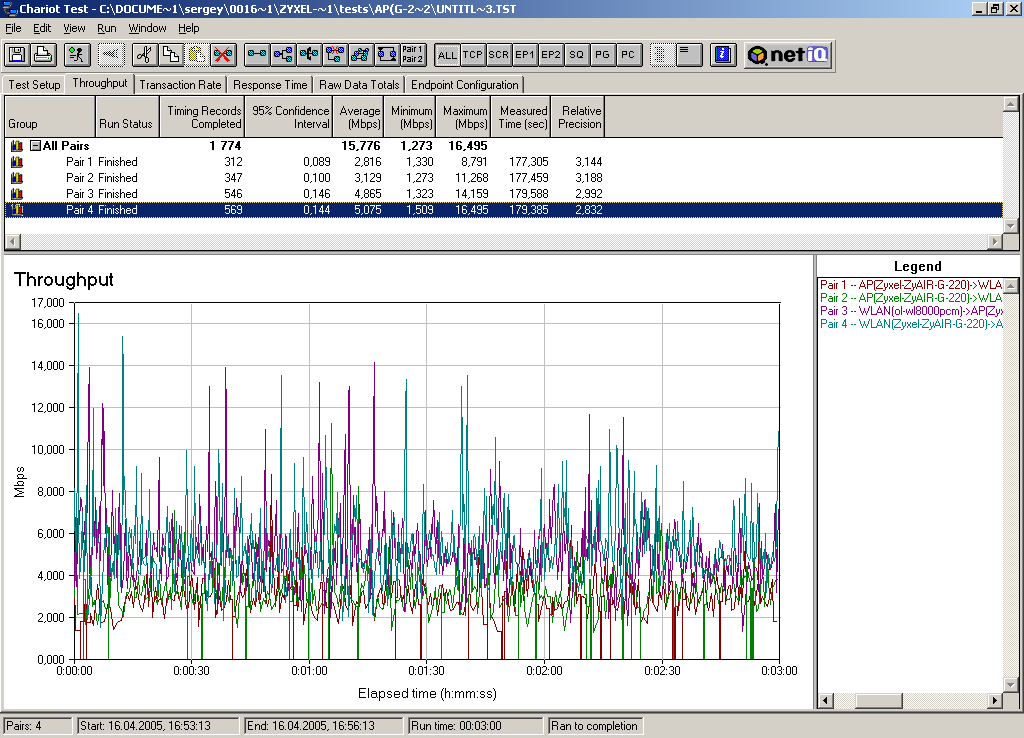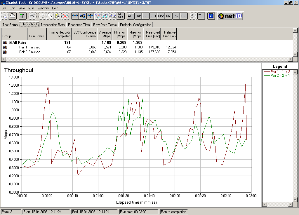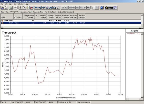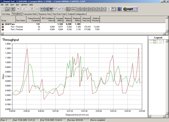 Тест "Беспроводной адаптер OvisLink WL-8000PCM — Беспроводной адаптер ZyXEL ZyAIR G-220 режим Infrastructure, точка доступа ZyXEL ZyAIR G-220" — трафик гонялся между USB-адаптером ZyXEL ZyAIR G-220 и Cardbus-адаптером OvisLink WL-8000PCM через точку доступа ZyXEL ZyAIR G-220. Тест проводился с помощью Chariot NetIQ. Расстояние между точками не превышало пяти метров.