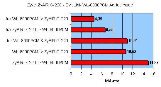 В случае работы двух адаптеров ZyXEL ZyAIR G-220 в AdHoc-режиме — скорость соединения сбрасывается до отметки 11 Мбит/с и остается на ней до разрыва и повторного установления соединения. Если же в режиме AdHoc работают 2 беспроводных адаптера разных фирм (в нашем случае это ZyXEL ZyAIR G-220 и OvisLink WL-8000PCM) — скорость значительно возрастает (в 2-3 раза).