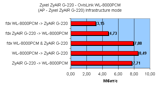 Тест "Беспроводной адаптер ZyXEL ZyAIR G-220- Беспроводной адаптер ZyXEL ZyAIR G-220, режим Infrastructure, точка доступа — OvisLink WL-8000AP" — трафик гонялся между двумя компьютерами с двумя беспроводными USB-адаптерами ZyXEL ZyAIR G-220. Скорость соединения выставлялась в режим Auto mode. Тест проводился с помощью Chariot NetIQ. Для теста использовалась точка доступа OvisLink WL-8000AP. Расстояние между точками не превышало пяти метров.