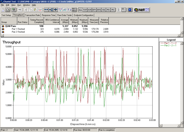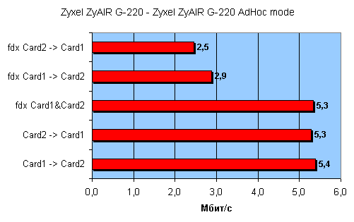 Тест "Беспроводной адаптер ZyXEL ZyAIR G-220 — Беспроводной адаптер ZyXEL ZyAIR G-220, режим AdHoc" — гонялся между двумя компьютерами с беспроводными USB-адаптерами ZyXEL ZyAIR G-220. Скорость соединения выставлялась в режим Auto. Тест проводился с помощью Chariot NetIQ. Расстояние между точками не превышало пяти метров.