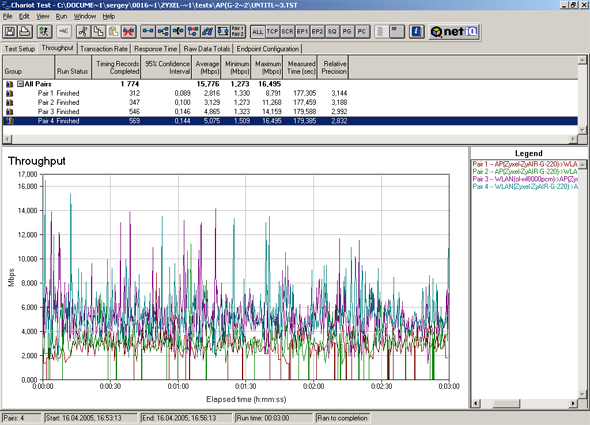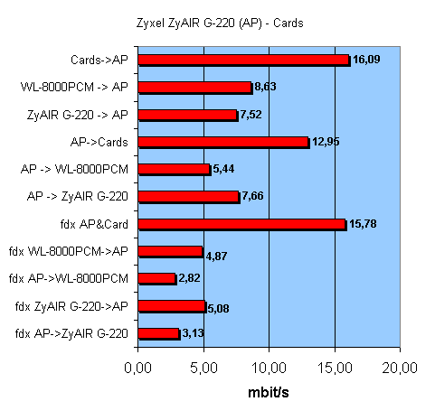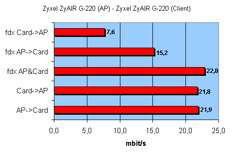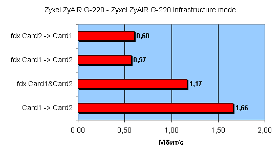 Тест "Точка доступа ZyXEL ZyAIR G-220 — Беспроводной адаптер ZyXEL ZyAIR G-220" – трафик гонялся между точкой доступа и компьютером с беспроводным сетевым адаптером. Скорость соединения выставлялась в режим Auto. Тест проводился с помощью Chariot NetIQ. Для теста использовалось 2 устройства ZyXEL ZyAIR G-220. Расстояние между точками не превышало пяти метров.