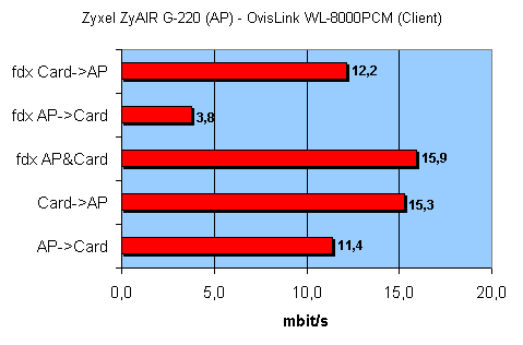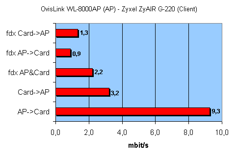 Тест "Точка доступа ZyXEL ZyAIR G-220 — 2 беспроводных адаптера: ZyXEL ZyAIR G-220 и OvisLink WL-8000PCM" — трафик гонялся между точкой доступа и двумя беспроводными адаптерами, причем один из них аналогичен точке доступа (ZyXEL ZyAIR G-220), а второй — от стороннего производителя (в данном случае OvisLink WL-8000PCM). Тест проводился с помощью Chariot NetIQ. Расстояние между точками не превышало пяти метров.