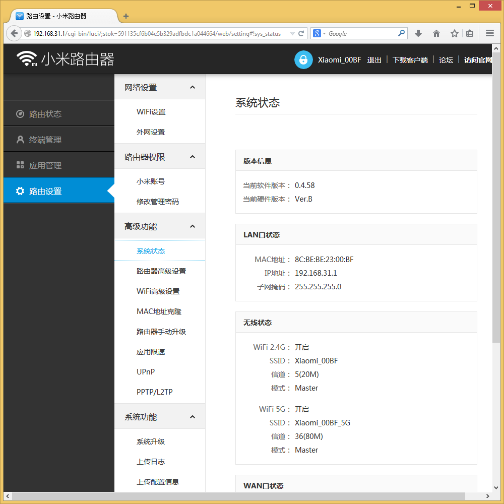В группе расширенных настроек находится более полная версия страницы статуса роутера, на которой можно посмотреть в том числе и MAC-адреса интерфейсов и номера/ширину каналов беспроводных сетей. Адреса клиентам, как обычно, раздаются встроенным сервером DHCP, пользователь может изменить диапазон адресов и собственный адрес роутера (по умолчанию 192.168.31.1). Расширенные настройки Wi-Fi позволяют установить мощность передатчика (три варианта) и выбрать номера каналов независимо для диапазонов 2,4 и 5 ГГц. Для второго поддерживаются три блока: 36, 40, 44, 48, 52, 56, 60, 64, 149, 153, 157, 161, 165. Формально для диапазона 2,4 ГГц можно выбрать ширину канала 40 МГц, однако по факту при наличии соседних сетей устройство автоматически переключается на 20 МГц (один канал, максимальная скорость соединения — 144 Мбит/с).