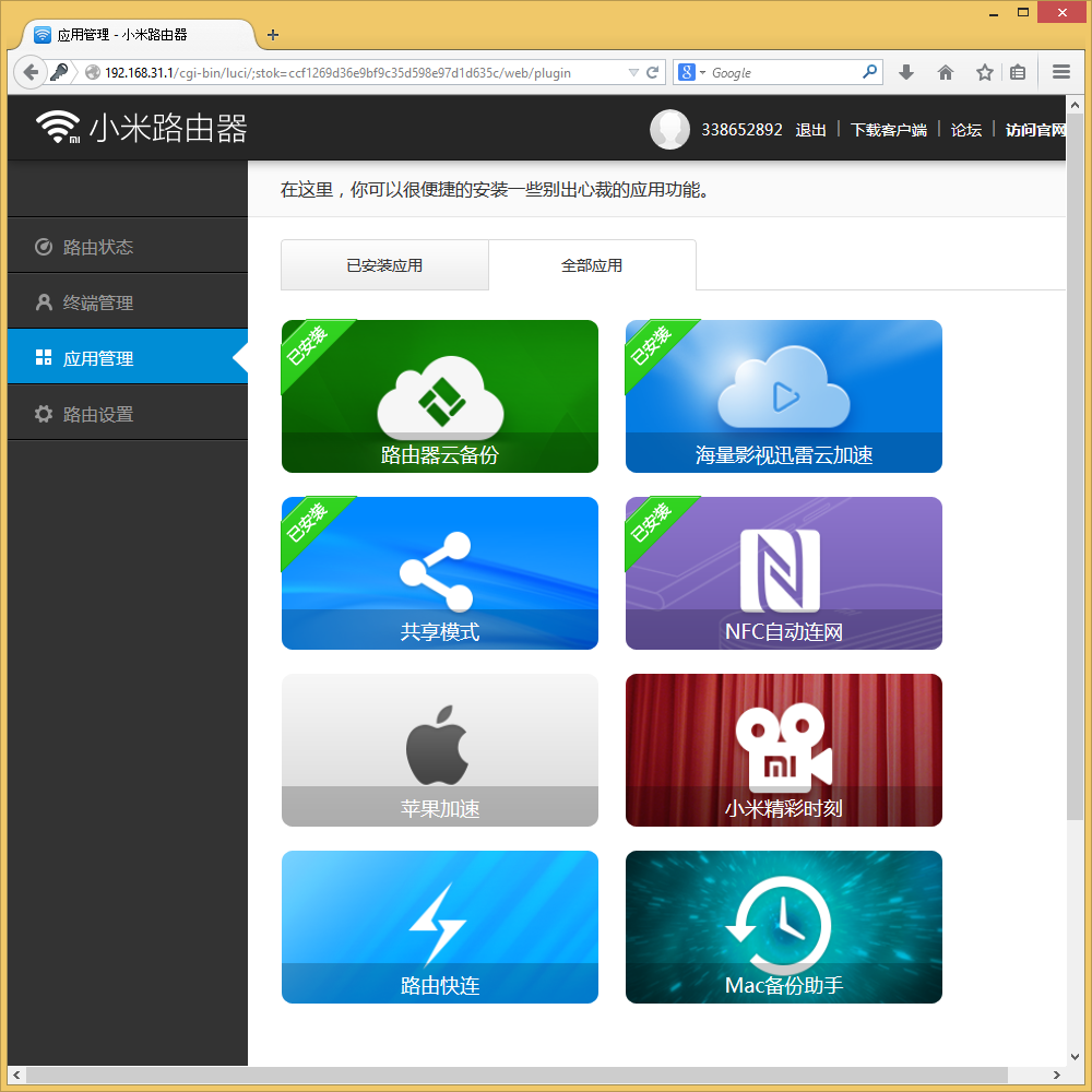 В левой части окна находятся ссылки на список клиентов, раздел управления приложениями и меню настройки роутера, состоящее из пяти групп.