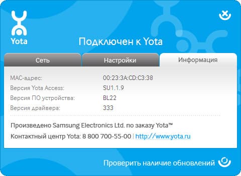 Во вкладке «Информация» вам доступны данные о Mac-адресе, версии программы Yota Access, прошивке модема и версии драйвера. Здесь же вы можете проверить наличие обновлений. Единственное найденное нами отличие между программами состоит в наличии русской локализации Yota Access — в Windows-версии во вкладке «настройки» вы можете выбрать английский или русский язык. Для Mac OS × Yota Access доступна только на английском языке. В целом Yota Access вполне комфортно и адекватно выполняет свою функцию и предоставляет довольно подробные данные по соединению, никаких претензий к ней нет.