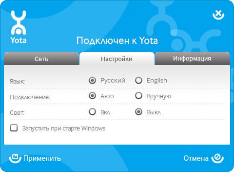 В «Настройках» вы можете выбрать способ подключения (ручной или автоматический), режим работы индикатора на USB модеме (включен или выключен), а также установить параметр автоматического запуска вместе с ОС.