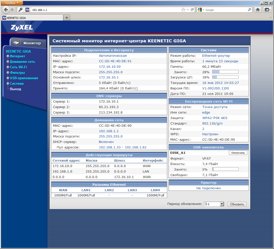 Первая страница, которую видит пользователь после ввода имени и пароля — системный монитор. Это очень удобная возможность быстро оценить состояние устройства — на ней указывается статус подключения к сети Интернет, таблица маршрутизации, режим беспроводного подключения и проводных портов, время работы устройства, версия прошивки, уровень загрузки процессора и оперативной памяти, состояние подключенных внешних устройств. Отметим и быстрые ссылки с некоторых параметров на соответствующие страницы настроек.