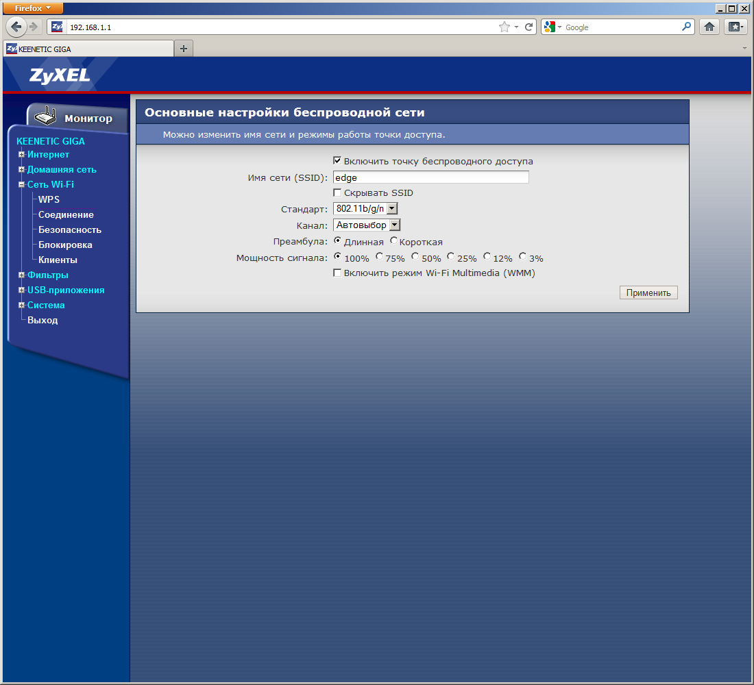 Следующая группа позволяет настроить беспроводную точку доступа устройства. Основные параметры включают в себя имя сети, стандарт, номер канала, мощность сигнала. Выбора максимальной скорости или режима «двойного канала» для 802.11n нет. На второй странице указывается режим шифрования. Устройство может работать в режиме открытой сети (настройка по умолчанию), с WEP, WPA/WPA2-PSK. Второй возможностью ограничения доступа является фильтр MAC-адресов. Он может работать в режимах белого или черного списка.
