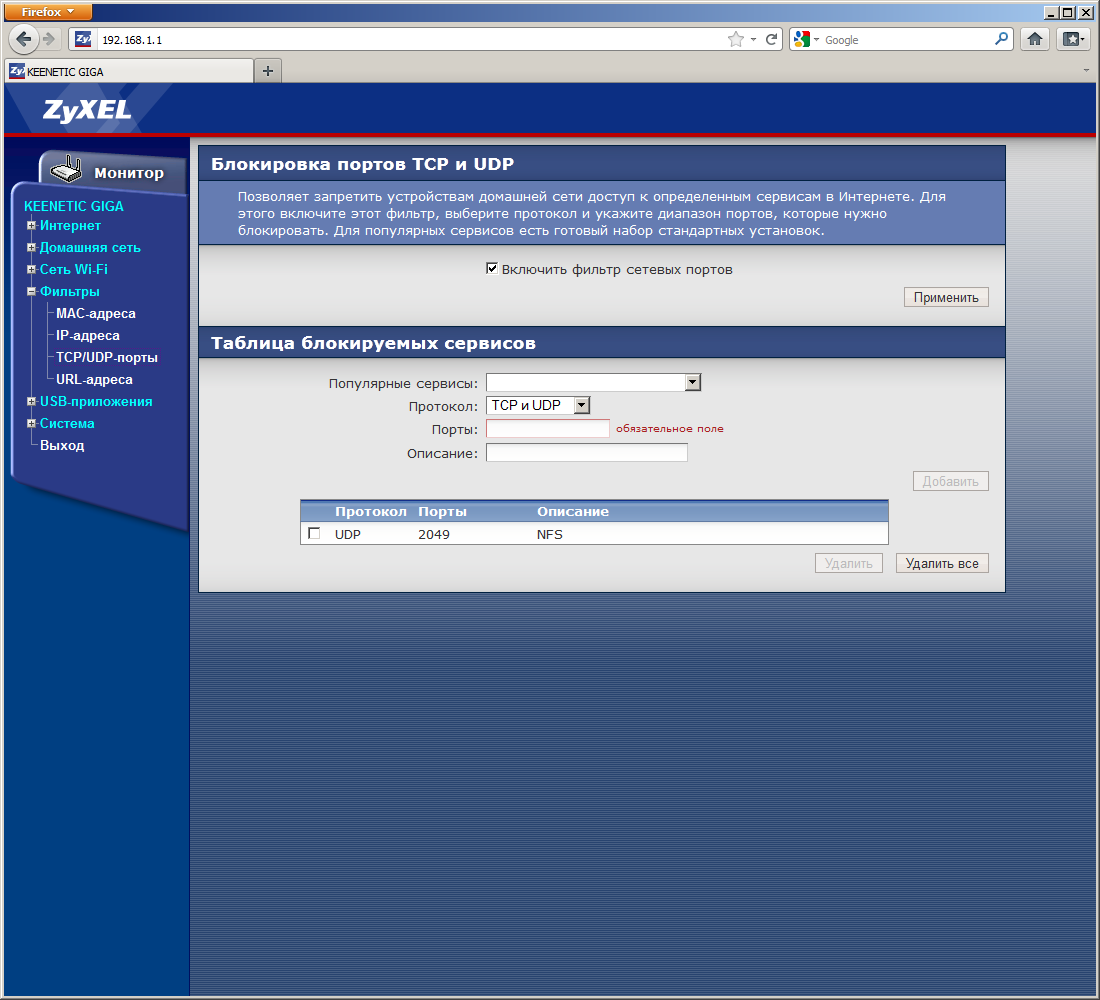 В группе «Фильтры» находятся настройки нескольких функций блокировки: фильтр MAC-адресов для сегмента LAN (работает в режиме черного или белого списка), фильтр IP-адресов клиентов для доступа в интернет (аналогично — черный или белый список), фильтр по ключевым словам в URL и универсальный фильтр удаленных портов для блокировки доступа к интернет-сервисам (работает сразу для всех локальных систем).