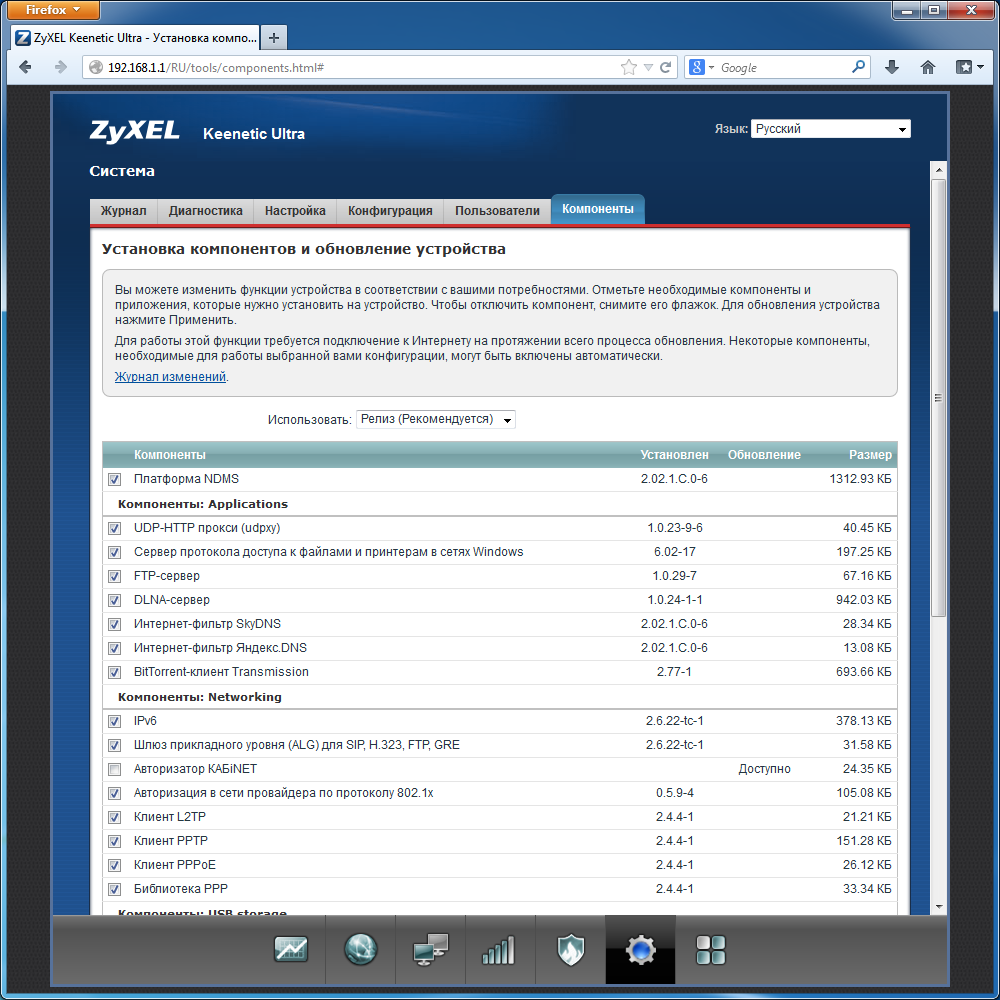 На странице «Компоненты» пользователь может проверить текущие версии программных модулей, выбрать требуемые ему (например, поддержку NTFS или модемов 4G) и обновить прошивку. Для модулей указывается также и занимаемый ими объем, но не очень понятно, какие ресурсы флэшпамяти доступны в текущий момент.