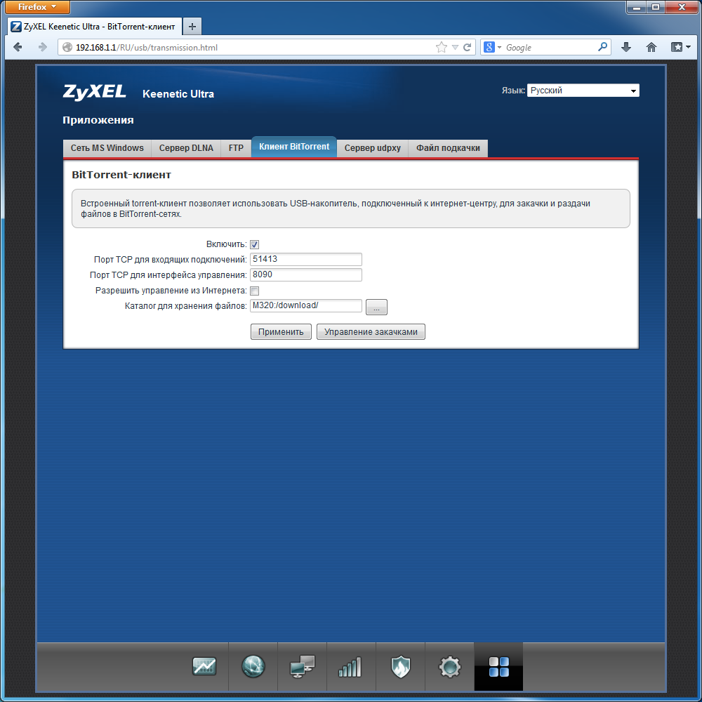 Реализован в прошивке и сервис автономной загрузки файлов по протоколу BitTorrent. Для этого используется популярная утилита transmission. В программе есть все стандартные настройки и возможность удаленного управления не только через браузер, но и специальными утилитами (в том числе и через интернет).