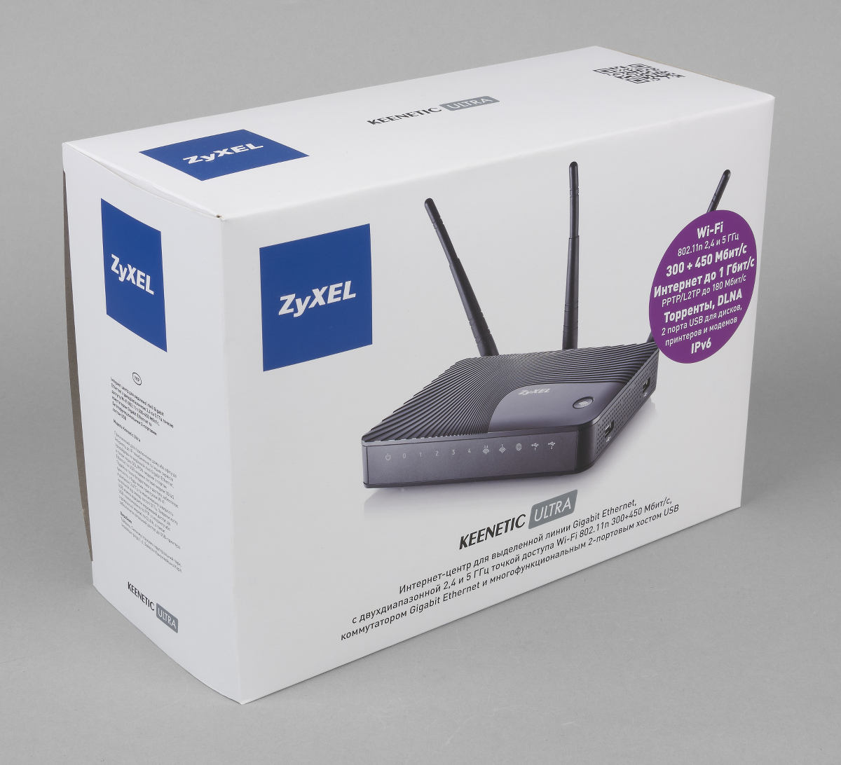 Роутер поставляется в достаточно крупной картонной коробке с внешней обложкой. Оформлена она традиционными для Zyxel цветами — белый фон, черный текст, синий логотип. На ней приводится фотография устройства, подробные технические характеристики, варианты использования и другая полезную информацию.