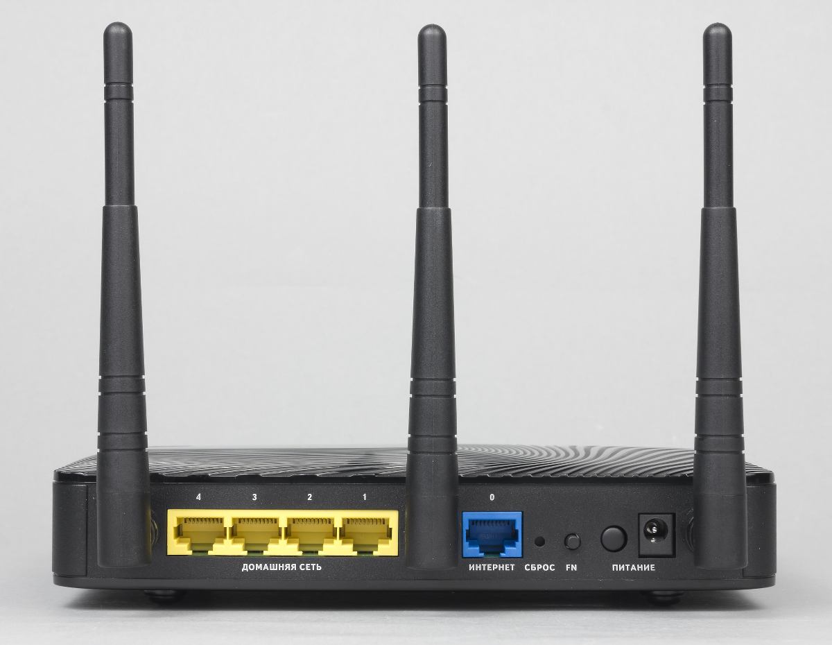 Сзади находятся все остальные разъемы и органы управления: гигабитный WAN, четыре гигабитных LAN, скрытая кнопка сброса, кнопка FN (используется для безопасного отключения USB-накопителей), вход блока питания и выключатель. Странно, что антенны сделали в этот раз несъемными. Конечно, в реальности мало кто пользуется возможностью установки и подключения альтернативных моделей антенн, но все-таки подобное решение характерно для бюджетных устройств, к которым Keenetic Ultra отнести сложно не столько по стоимости, сколько по возможностям и функциям. Кстати, производитель в этот раз использует не «съемные всенаправленные антенны 5 дБи», а «внешние всенаправленные антенны Wi-Fi (3 дБи)». Отметим, что у других представителей второго поколения, в частности Keenetic Giga II, используется именно первый вариант. Скорее всего, подобное решение было связано с поддержкой двух диапазонов работы, подобрать хорошие сменные варианты для которых не удалось.
