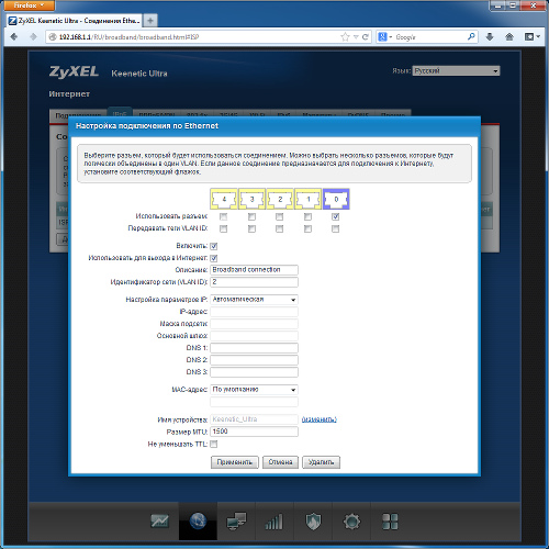 Веб-интерфейс роутера имеет поддержку двух языков — русского и английского. К сожалению, встроенной справочной системы производитель пока не реализовал. Учитывая увеличение числа функций и расширение возможностей, она пришлась бы кстати. Отметим, что внешний вид и организация интерфейса существенно изменились и больше соответствуют внутренней структуре новой прошивки. Главное меню групп настроек находится в нижней строке страницы. При этом сами группы обозначены значками без текстовых подписей, но с всплывающими подсказками. Для перехода между страницами используются закладки в верхней части окна.