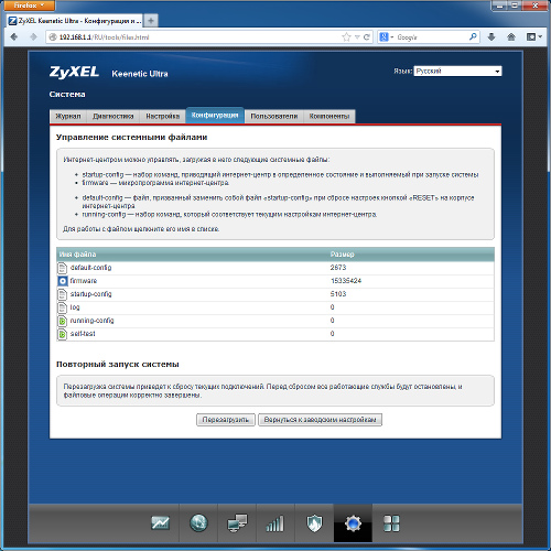 Как мы говорили выше, работа с настройками и прошивкой в данном устройства реализована нестандартно. В частности, конфигурация представлена в виде системного файла, который можно скачать или заменить.