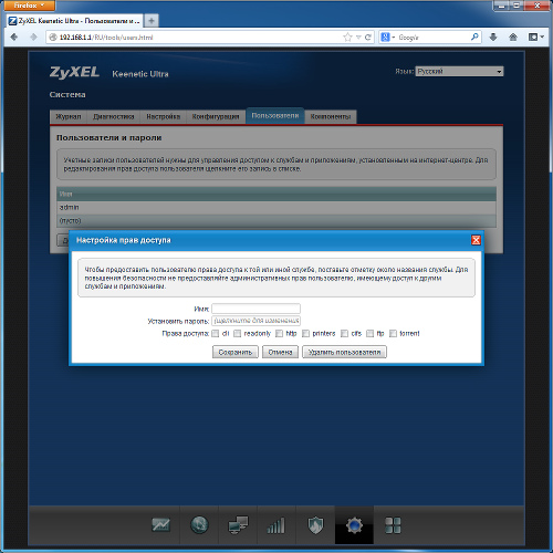 Для диагностики возможных проблем присутствует традиционный журнал событий (с возможностью отправки на сервер syslog) и встроенная утилита ping. Отметим возможность удобного общения с техподдержкой благодаря встроенному индивидуальному сервисному коду в каждом экземпляре роутера. Другие системные опции включают в себя установку сетевого имени и названия рабочей группы, настройку встроенных часов и перезагрузку. Поскольку устройство имеет широкий набор функций, система разграничения прав пользователей здесь смотрится вполне органично. В каждой записи указывается имя и пароль, а также доступные пользователю сервисы, например сетевой доступ или работа с сервером FTP.