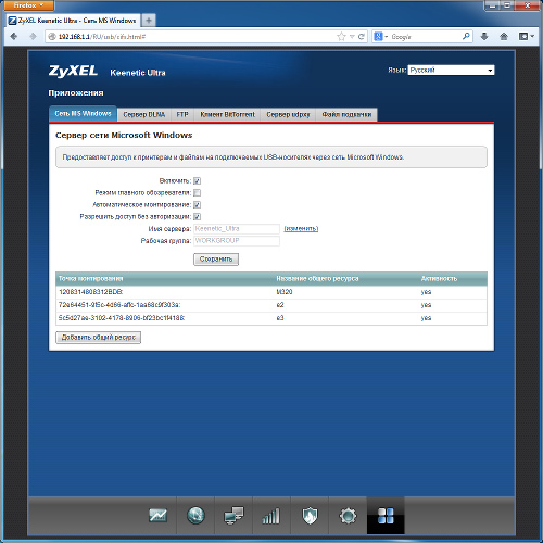 Накопители могут иметь несколько разделов, каждому будет соответствовать своя сетевая папка. Поддерживается работа с файловыми системами FAT32, NTFS, EXT2, EXT3, HFS+ (последний вариант — после установки соответствующего модуля). Интернет-центр запоминает подключенные устройства по идентификатору, так что в случае переподключения сетевое имя и настройки сохраняются.