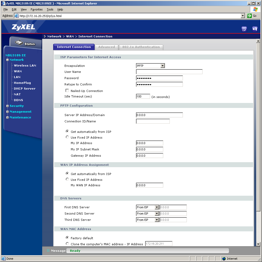 Следующий по порядку, но не важности, интерфейс — собственно интернет-подключение. Для него поддерживаются следующие варианты: прямое подключение, PPPoE, PPTP и L2TP. Для отечественных пользователей большой интерес представляет технология LinkDuo, обеспечивающая одновременную работу как с Интернет, так и с локальной сетью провайдера. Все варианты настроек максимально гибкие — можно указать MAC- и IP-адреса порта WAN и необходимые серверы DNS. Предусмотрена и поддержка протокола 802.1x.