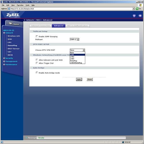 Еще одна настройка режима работы находится в группе «Maintenance». Она позволяет выбрать одну из схем функционирования: роутер с Ethernet-портом WAN, роутер с HomePlug подключением к Интернет или просто беспроводная точка доступа.