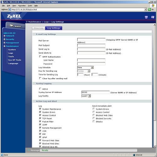 Последняя функция здесь — работа с логами интернет-центра. Список событий обычно сохраняется только в памяти устройства, при этом его объем ограничен и новые записи вытесняют самые старые. Так что если вы хотите точно знать, что и когда происходило, — необходимо настроить регулярную отправку данных на адрес электронной почты. Поддерживается использование серверов SMTP с авторизацией, но шифрования нет. Второй вариант не потерять записи — установить сервер syslog и хранить данные на нем.