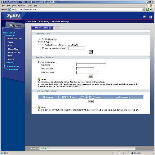 Второй моделью из новой линейки интернет-центров компании ZyXEL, попавшей в нашу лабораторию, стал NBG318S. Отличительной его особенностью является встроенный адаптер сети HomePlug AV, который используется для подключения устройств по проводам электропитания. Это решение позволяет провести высокоскоростную сеть в точки, в которых не было предусмотрено компьютерной проводки. Например, для IPTV-приставки около телевизора. Единственное, что надо учесть при использовании данного типа подключения, это зависимость от протяженности линии, необходимость установки устройств на одну линию фазы и невозможность использования сетевых фильтров и ИБП.