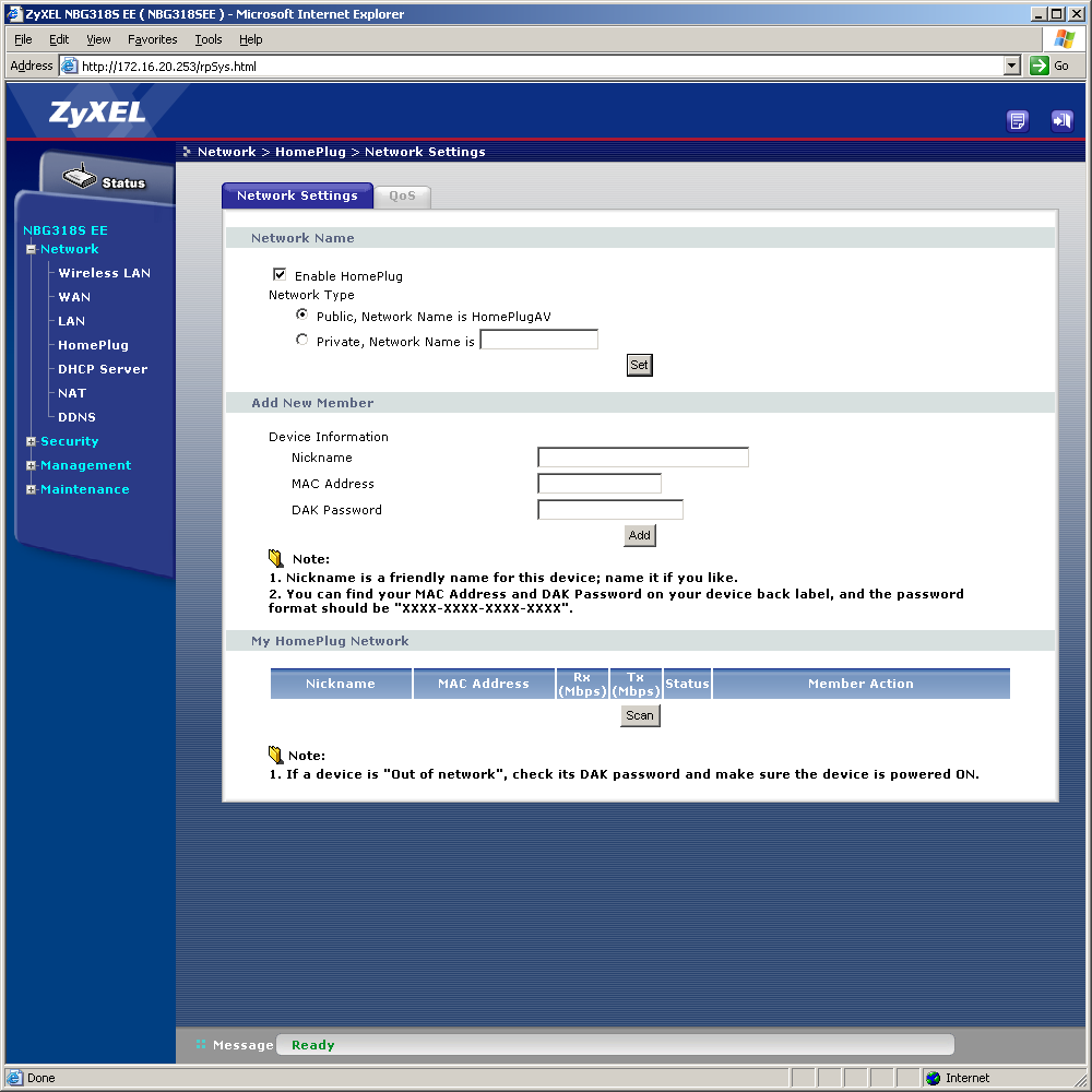У HomePlug страница интереснее: кроме выбора имени сети, можно прямо с интернет-центра управлять ее составом, подключая новых клиентов. Для этого достаточно знать MAC-адрес и уникальный номер адаптера (DAK), которые обычно записаны на наклейке на нижней стороне корпуса. Для этого сегмента предусмотрено управление приоритетами (QoS). В правилах можно указать клиента и его приоритет. Также есть установка для различных типов трафика — IGMP, Unicast, Multicast. Данная технология может повысить качество работы IPTV в случае интенсивного трафика в сегменте.
