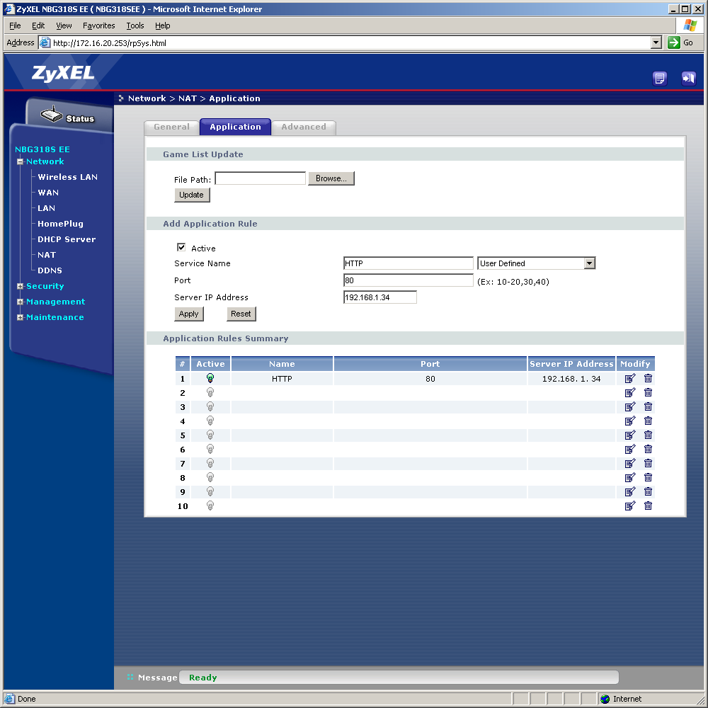 Для обеспечения одновременного доступа к Интернет с нескольких компьютеров, в устройстве реализована технология трансляции сетевых адресов (NAT). При необходимости ее можно отключить, тогда NBG318S будет работать в режиме роутера. Из настроек присутствует перенаправление портов и правила «триггеров».