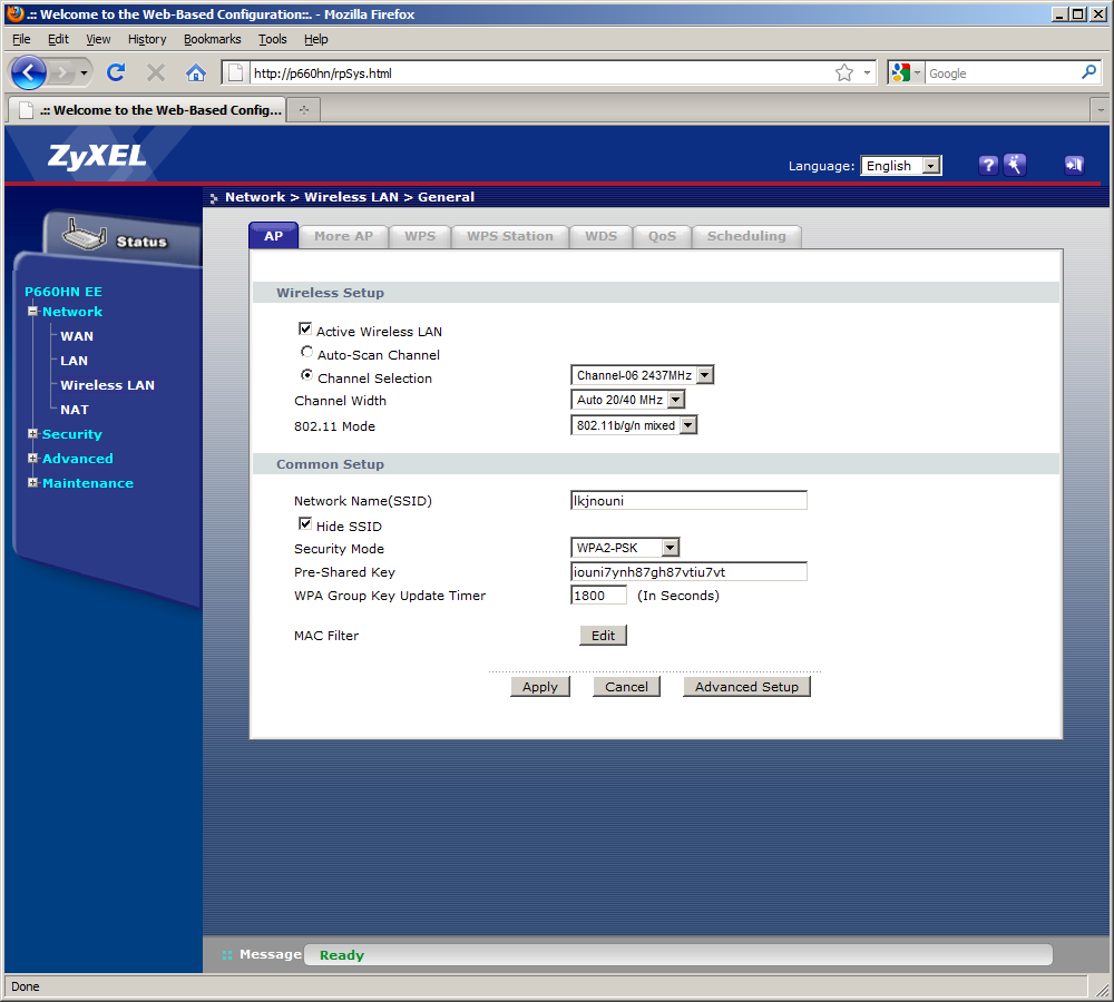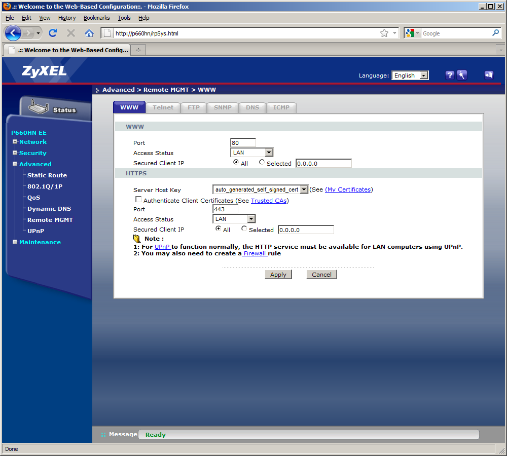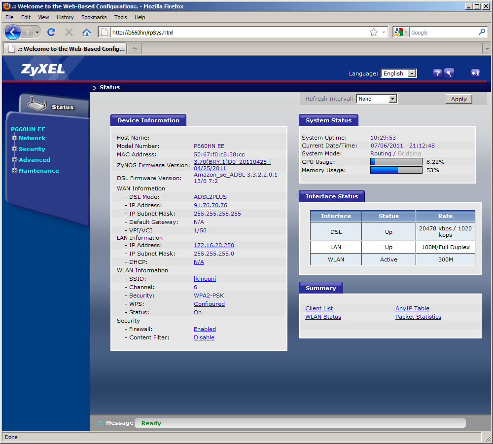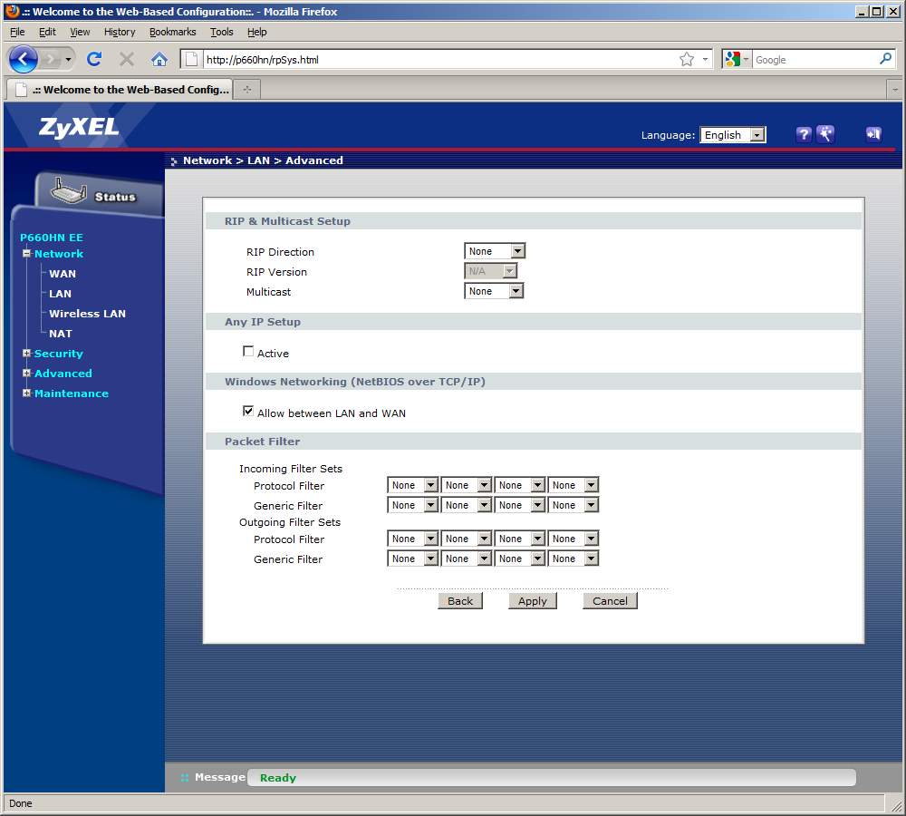 Все пункты собраны в четыре группы — «Network», «Security», «Advanced» и «Maintenance». Как уже понятно из этих слов — перевода на русский язык у него нет. Хотя есть варианты немецкого, французского, итальянского и даже турецкого.