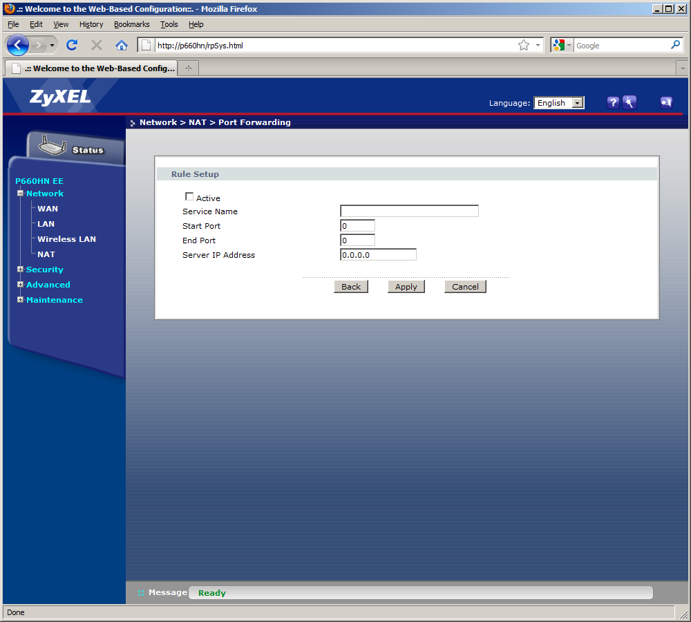 Доступ в интернет осуществляется по технологии трансляции сетевых адресов (NAT). В ней предусмотрено программирование портов для доступа внешних устройств к сервисам внутри локального сегмента. В параметрах указывается только диапазон портов и IP-адрес клиента. Так что внешние и внутренние порты не могут отличаться и отдельного выбора протокола TCP или UDP тоже нет. Упомянем встроенный ALG для протокола SIP.