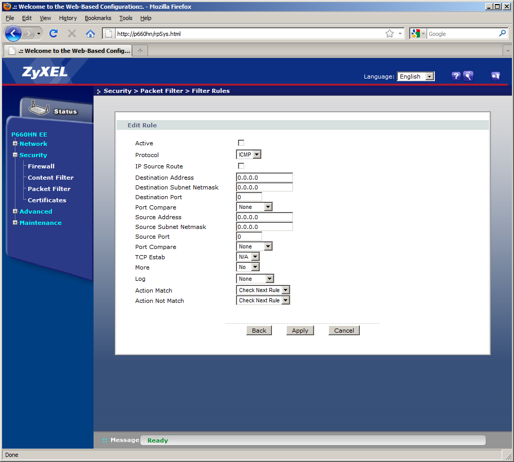 В группе «Security» пользователь может настроить встроенный межсетевой экран, фильтр контента, а также пакетный фильтр. Firewall работает на сегменте WAN-LAN, его правила могут включать в себя адреса источника и получателя, а также порты/сервисы. Для каждого правила можно указать расписание работы и действие (Permit, Drop, Reject).