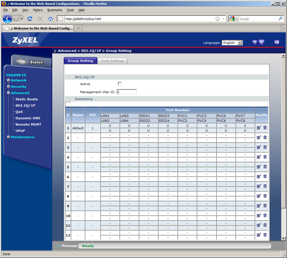 Настройки всех сетевых интерфейсов объединены в группу «Network». Как мы уже говорили выше, указать верные параметры для ADSL-соединения проще всего с использованием программы NetFriend. Но при желании можно все сделать и самостоятельно. Устройство традиционно поддерживает до восьми виртуальных подключений (PVC), каждое в режиме маршрутизации (обычно для работы с интернетом) или моста (часто используется для трансляции ТВ).