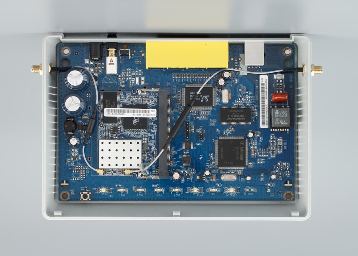 Аппаратная база устройства основана на процессоре Infineon PSB 50601 HL. В него же встроен и блок работы по линии ADSL. Объем оперативной памяти составляет 32 МБ, а для прошивки используется флеш-чип на 4 МБ. Сетевой коммутатор представлен микросхемой Realtek RTL8306SD. Она, к сожалению, поддерживает скорости только FastEthernet (100 Мбит/с). Конечно, при максимальной производительности ADSL на уровне 20 Мбит/с использование внутренних гигабитных портов не увеличит скорость доступа к интернету, однако если мы говорим о современном универсальном устройстве, то многим пользователям сегодня вполне пригодились бы гигабитные порты.